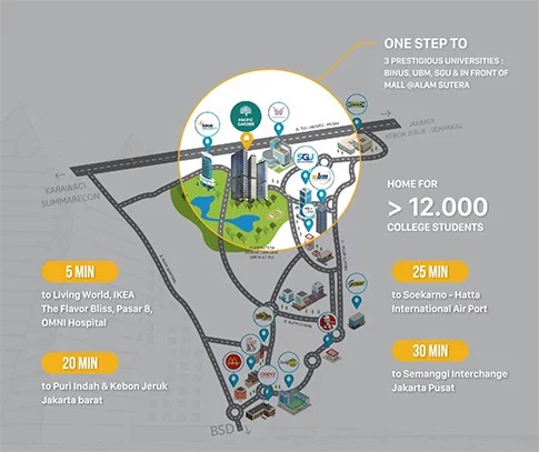 Lokasi Pacific Garden Campus Town @Alam Sutera menempati posisi strategis di Downtown @Alam Sutera, Selangkah dari Universitas Binus & Mall @ Alam Sutera.